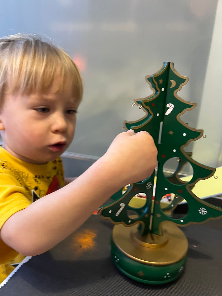 The highlight of our classroom is a lovely wooden Christmas tree that doubles as a music box. The children carefully hung tiny wooden decorations, an activity that not only added to the festive ambiance but also helped strengthen their fine motor skills and concentration.